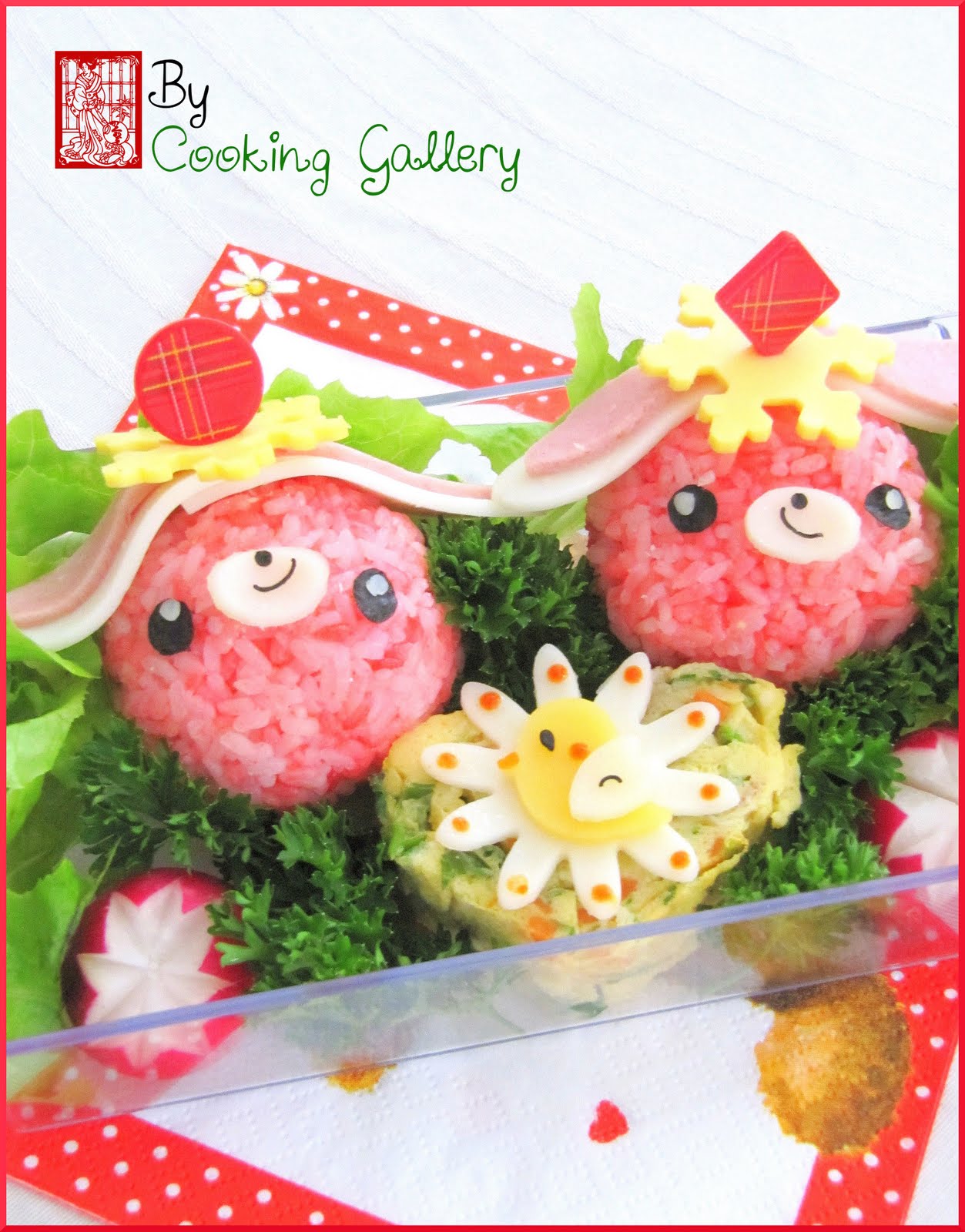 The two pink onigiri balls are filled with umeboshi (pickled plum). There is also a heart tamagoyaki decorated with cheese flower.